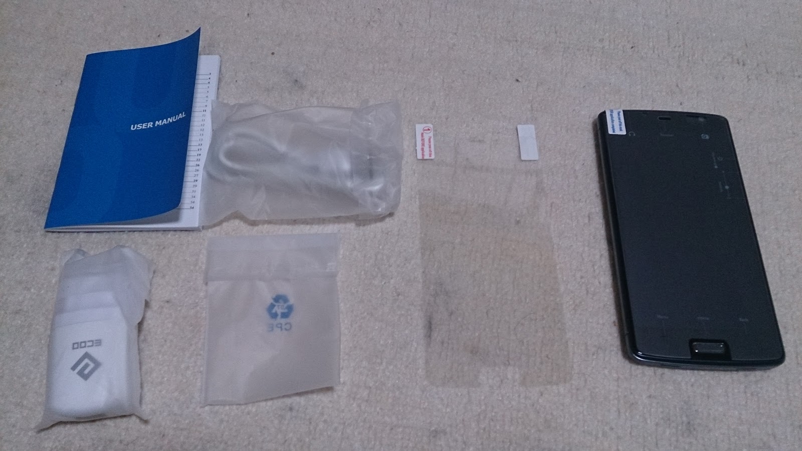 左から、ユーザーマニュアル、USB充電器、ACアダプタ(中華版)、空の袋、保護フィルム、本体です