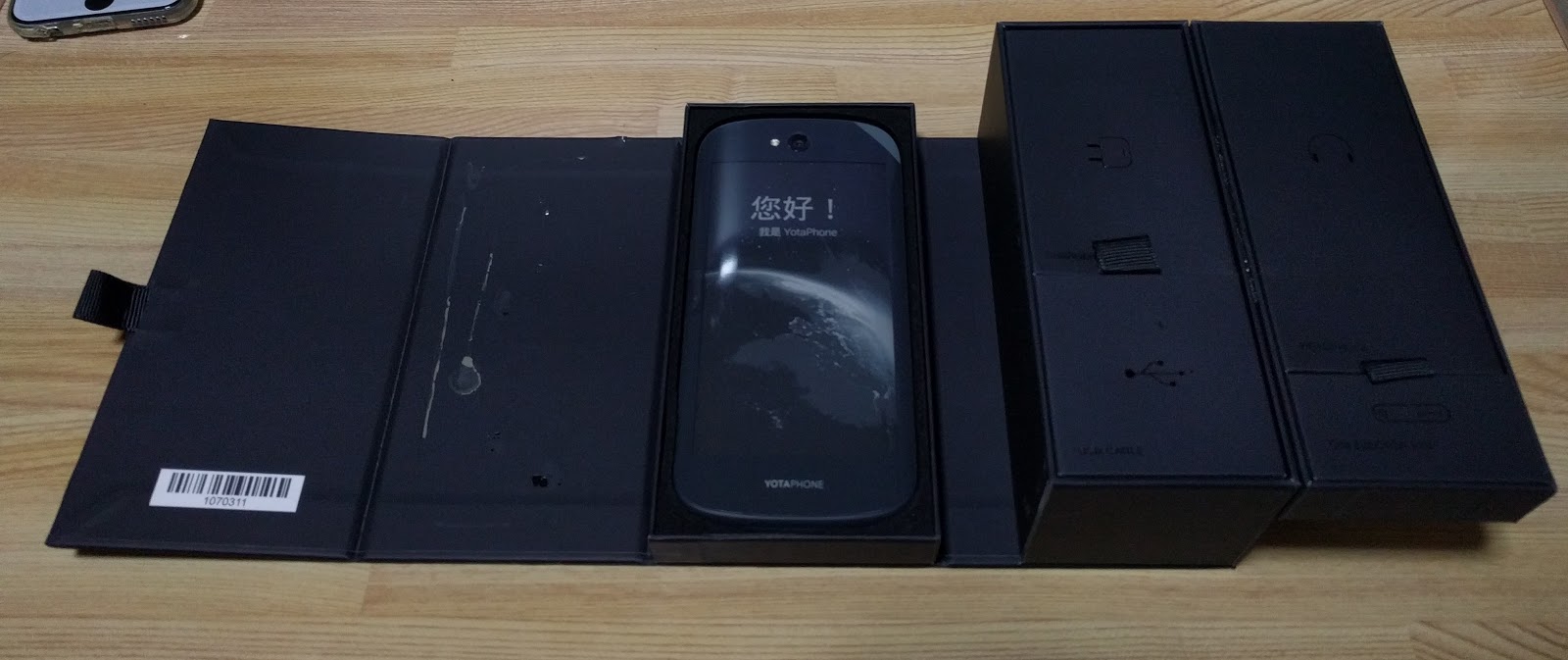 Yotaphoneに既に電源がついているように見えますが、これは電子ペーパー側が上になっていて電源がついていなくても表示を維持するE-Inkの特性を活かした洒落たはからいです。