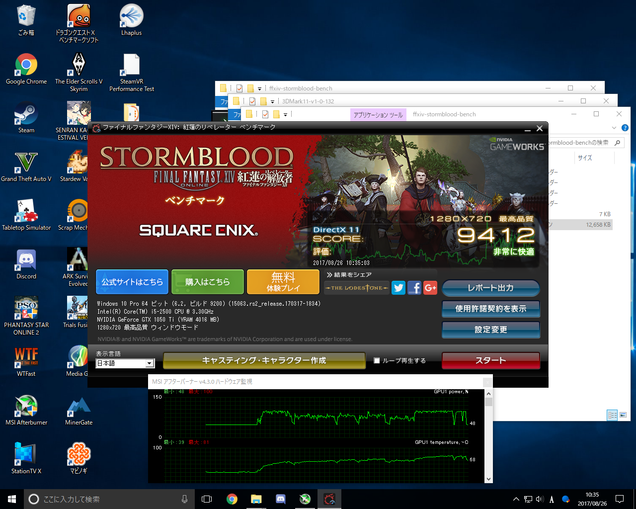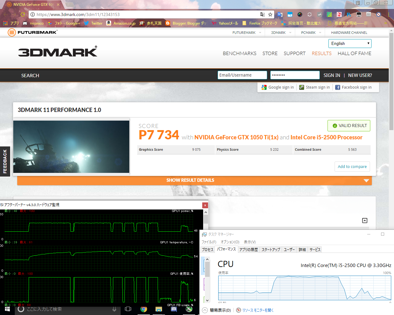 3Dベンチマークの代名詞の3DMARKでは7743点でした。同CPUにGTX750Tiを載せたときは4664点だったのでGPUの進歩を感じますね。